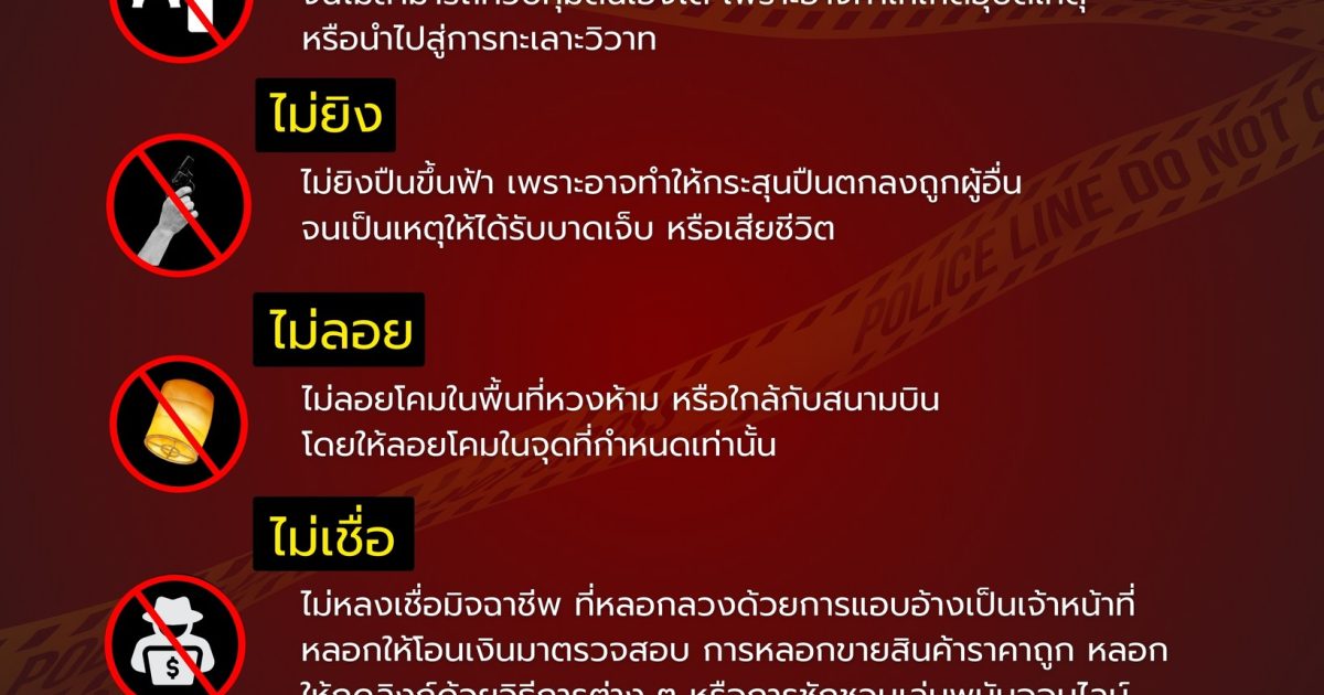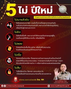 สำนักงานตำรวจแห่งชาติ จึงขอแนะนำ “5 ไม่” ปีใหม่ ส่งท้ายปีเก่า เพื่อให้พี่น้องประชาชน ระมัดระวังการกระทำที่อาจก่อให้เกิดอันตรายกับบุคคลอื่น และอาจเข้าข่ายเป็นความผิดตามกฎหมาย รวมไปถึงระวังภัยจากมิจฉาชีพที่อาจฉวยโอกาสก่อเหตุในช่วงเทศกาล ดังนี้
